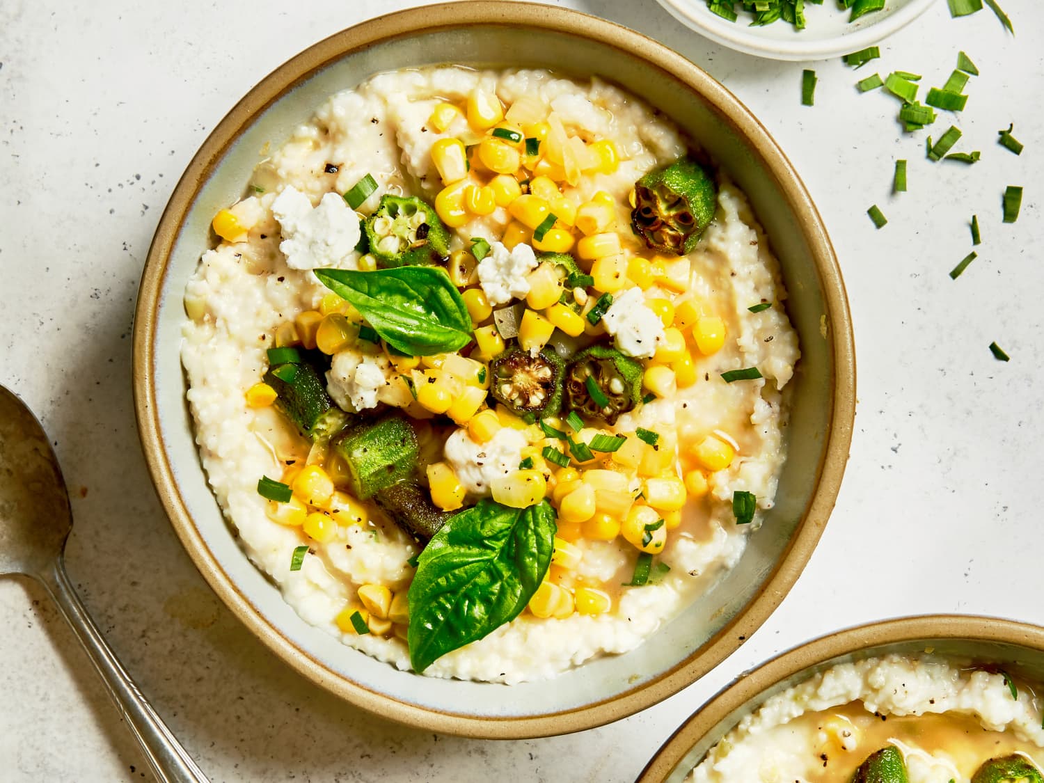 Brittany Conerly S Southern Style Grits With Okra Corn And Goat Cheese Kitchn